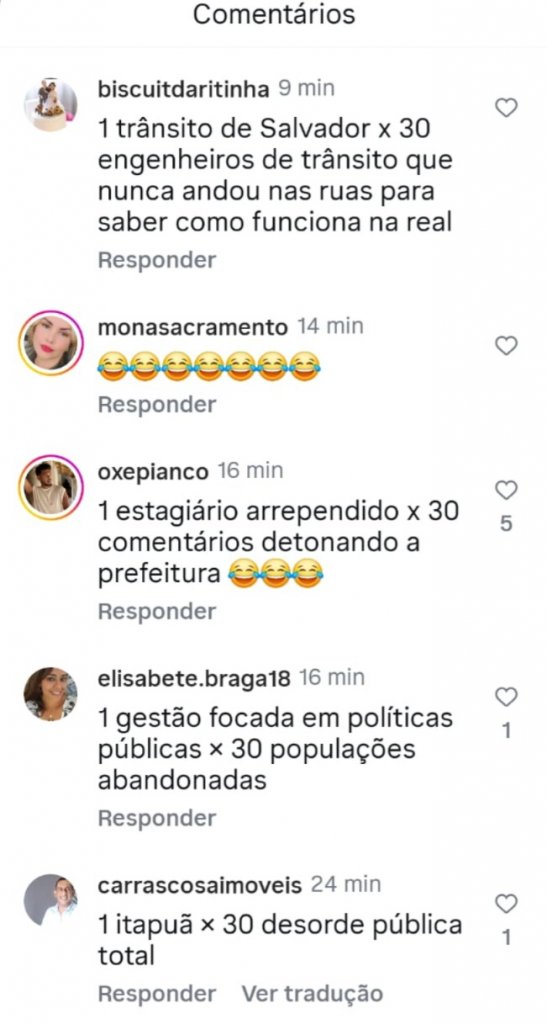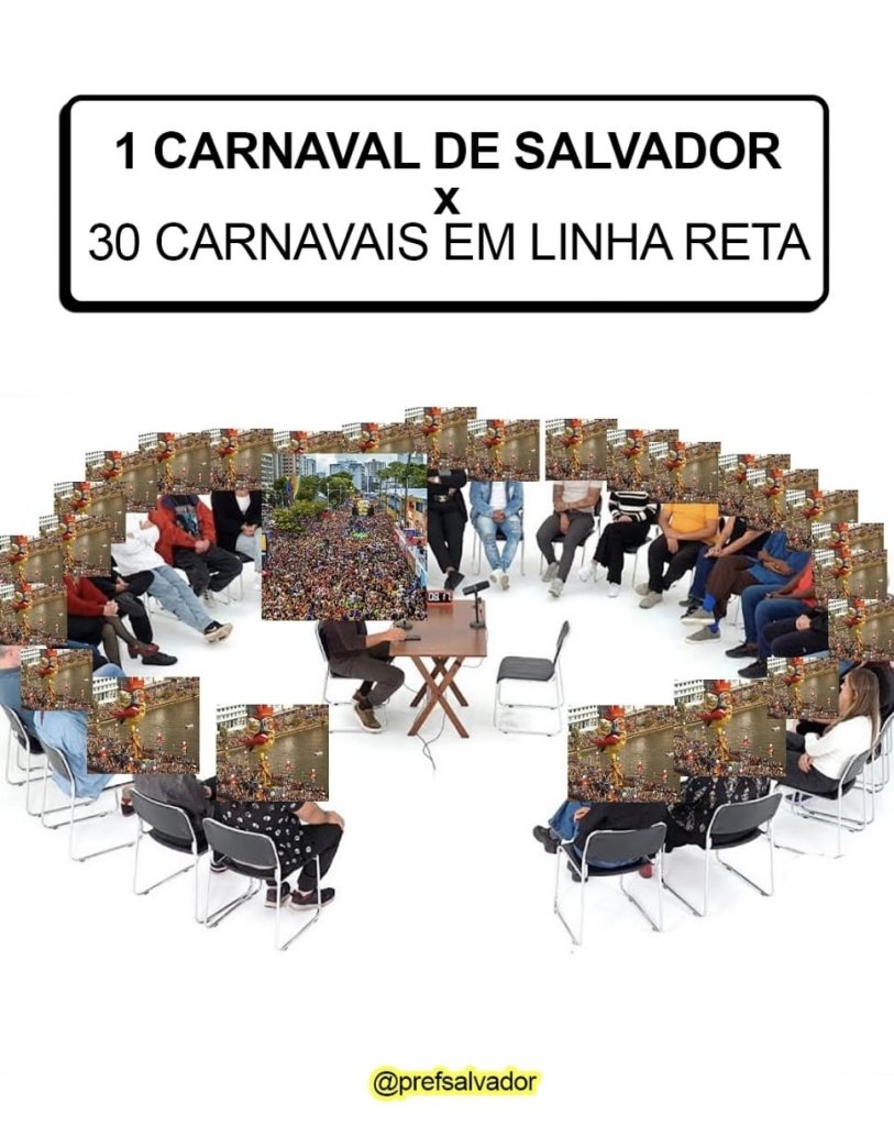 Na postagem, são colocados flyers  que comparam as "coisas da Bahia" com outros estados ou situações tipo: "1 Carnaval de Salvador X 30 carnavais em linha reta" ou " 1 moqueca baiana X 30 moquecas capixabas"e tudo seria muito engraçado se os seguidores da Prefeitura não tivessem resolvido não achar graça nenhuma e colocado comparações tipo " 1 prefeito X 30 professores em greve, ou "1 lugar verde X 30 projetos de desmatamento" se referindo a fama de Bruno Reis de ser o "Majestade do cimento". As queixas vão de 1 transporte caro X 30 ônibus velhos, passam por "1 clinica TEA X 30 crianças com autismo" e vão até " 1 médico X 100 pessoas na UPA!