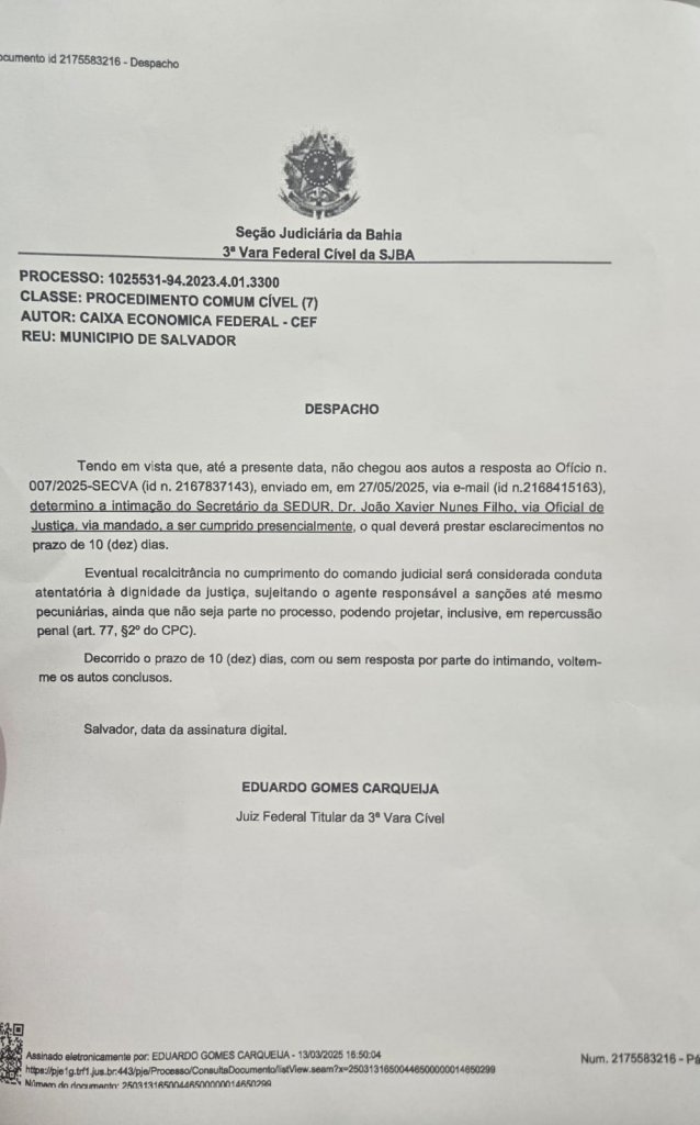 O secretário da Sedur - João Xavier Nunes Filho - foi Intimado para explicar, sob pena de multa e ato atentatório a dignidade da Justiça, porque não respondeu o Ofício enviado pela 3 Vara Federal Civil da SJBA. Solenemente ignorada, a intimação - que leva risco ao CPF do Secretário de receber processo penal por descumprir ordem judicial - se refere a um processo no qual a Caixa Econômica Federal obteve decisão favorável e no qual visa saber, se vai ou não, poder fazer uso de Transcons originários da Fazenda Tauassú, recebidos de boa fé em pagamento, com a anuência da Prefeitura, que, depois do negócio feito, suspendeu seu uso desde 2013 e - de lá ate hoje - enrolava sem resolver o problema!