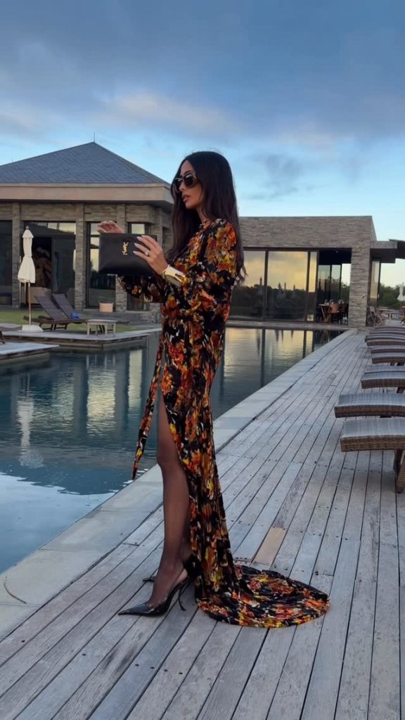Para um dos eventos de pré-casamento, apostou em um vestido fluido estampado da coleção Pre-Fall 2026 da Saint Laurent, combinado com joias da Tiffany & Co., em um look elegante que dialoga com o cenário sofisticado do destino.