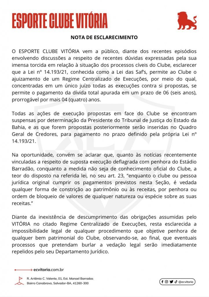 O Vitória também disse que todas as ações executadas contra o clube estão suspensas por determinação do presidente do Tribunal de Justiça da Bahia. Além do mais, novos processos que venham a ser propostos serão incluídos no Quadro Geral de Credores, com prazo de pagamento definido pela Lei nº 14.193/2021, que determina até seis anos, prorrogáveis por mais quatro, para quitação do montante devido.