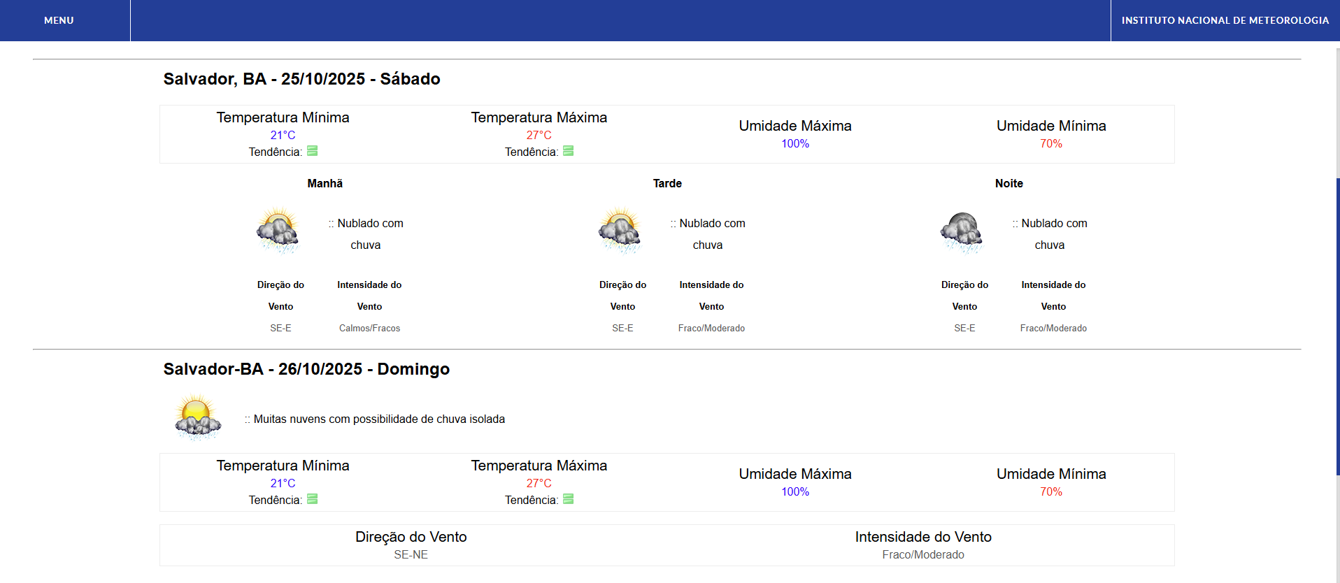 No sábado (25), o sol deve surgir entre nuvens, com 60% de probabilidade de chuva. As temperaturas devem variar entre 21°C, mínima, e 30°C, máxima. Os ventos soprarão com intensidade moderada, podendo atingir até 24 km/h, de acordo com os institutos de meteorologia.