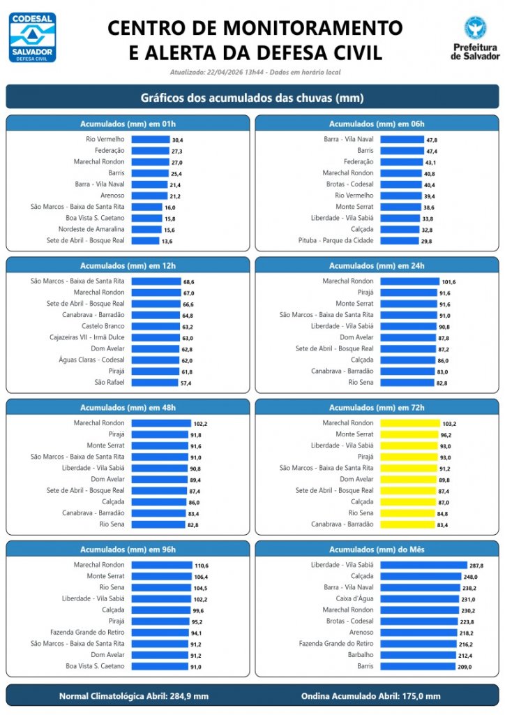 Nas últimas seis horas desta quarta-feira (22), o maior volume de chuva aconteceu no bairro da Barra, na Vila Naval, onde foram registrados 47,8 milímetros. Logo na sequência aparece Barris, com 47,4 mm, depois Federação, com 43,1 mm.
