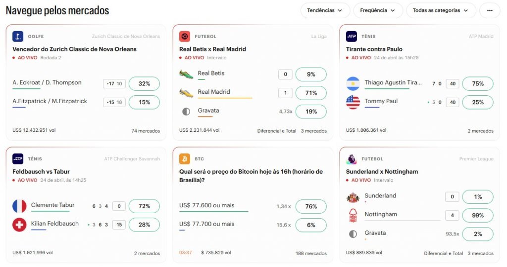 As norte-americanas Kalshi e Polymarket são as principais atuantes no mercado de previsão nos Estados Unidos. Nestas plataformas, você pode comprar ou vender previsões de resultados de eleições, acordos geopolíticos e até mesmo previsões sobre preços de produtos.