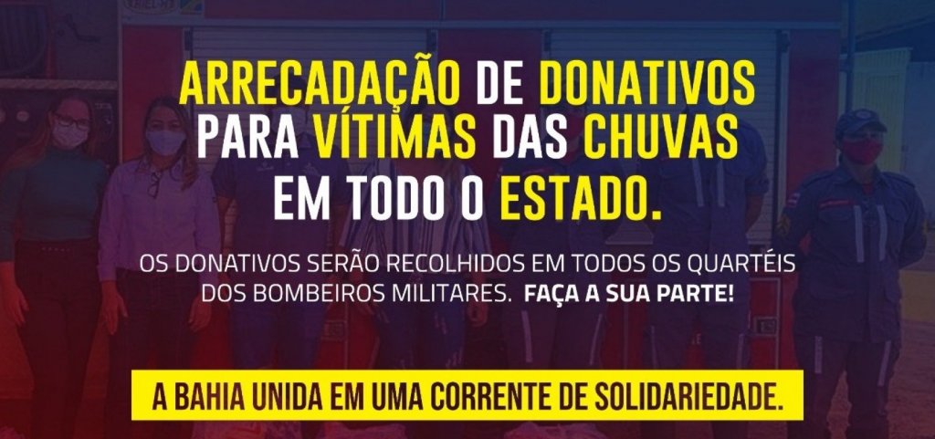 Nesta sexta-feira (10), o Corpo de Bombeiros Militar da Bahia (CBMB) lançou uma campanha de arrecadação de donativos para as vítimas das fortes chuvas no interior baiano. Quem quiser doar deve ir até um dos quartéis do Corpo de Bombeiros para deixar o donativo.