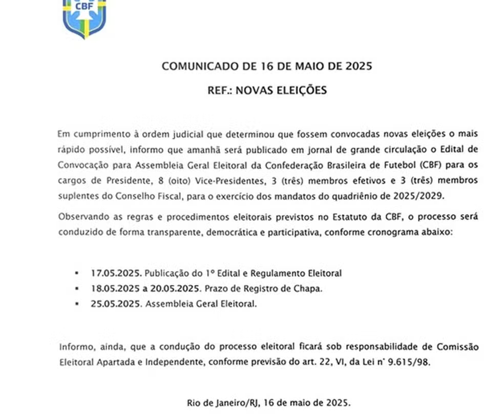 O pleito ocorrerá um dia antes da apresentação do italiano Carlo Ancelotti como novo técnico da Seleção Brasileira. O edital será publicado neste sábado (17), com as chapas registradas entre os dias 18 e 20 de maio. Vale lembrar que o período do mandato é quadriênio (2025 - 2029).