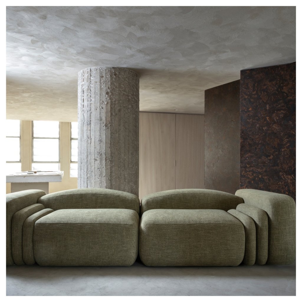 A inspiração está na forma e na essência. Os volumes do sofá se expandem e se retraem como fole de acordeom, criando diferentes possibilidades de uso. Os tecidos naturais são combinados com uma paleta cromática livre, que rompe com a previsibilidade do bege, do off-white e do cinza. Mais do que um assento, o Acordeon é uma partitura visual. Uma celebração do corpo em repouso e do afeto em movimento.