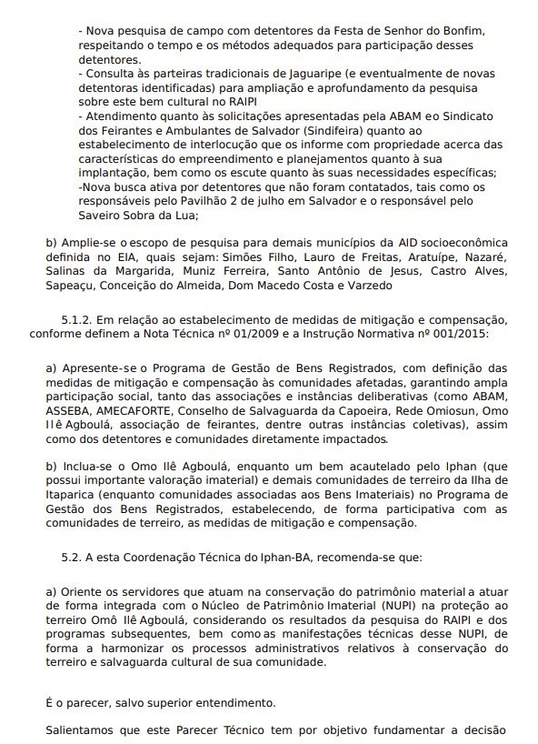 No documento divulgado, o Iphan classificou como insuficientes as pesquisas da SVPonte que avaliam os danos às comunidades tradicionais, e recomendou uma série de ações complementares para emitir parecer favorável à instalação do equipamento. Confira na íntegra:
