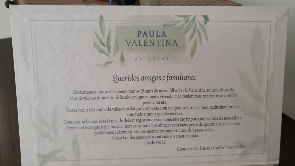 No dia 25 de julho, a jovem Paula Valentina, filha de Taissa Gama e Carlos Vasconcellos completa 15 anos. Por conta da pandemia que assola o mundo, os pais da aniversariante optaram em não realizar a tradicional festa. Mas da valsa, eles não abriram mão e decidiram que o momento mais esperado da debutante acontecerá na casa de seus avós Natal e Benito Gama. A valsa será orquestrada pelo cerimonialista Marcos Palmeira, que dispensa apresentações. Após a dança, Paula oferecerá um jantar para seus amigos mais intimos assinado pelo Chef Vini Figueira. Em forma de agradecimento aos amigos da família, a mãe coruja Taissa Gama enviou uma linda caixa de doces em que explica o motivo de não poder compartilhar esse momento tão importante.