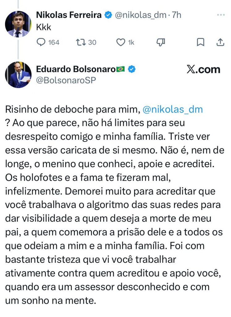 Na sequência, Eduardo comenta ter interpretado o riso do mineiro como um deboche. “Risinho de deboche para mim, Nikolas”, escreveu Eduardo. “Ao que parece, não há limites para seu desrespeito comigo e minha família. Triste ver essa versão caricata de si mesmo. Não é, nem de longe, o menino que conheci, apoiei e acreditei. Os holofotes e a fama te fizeram mal, infelizmente.”