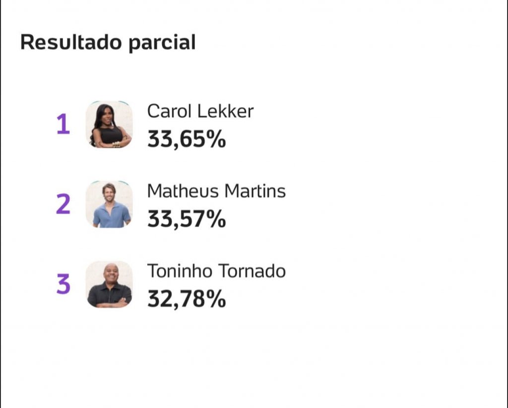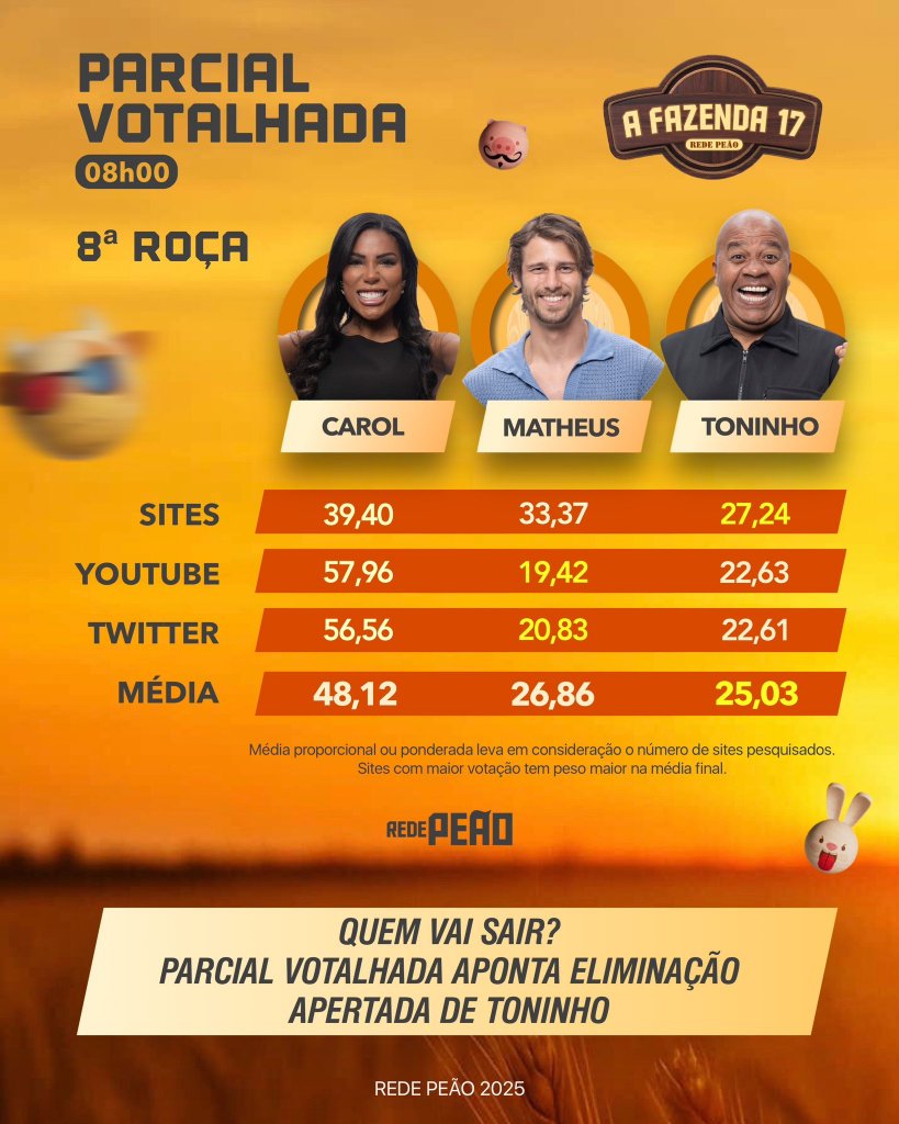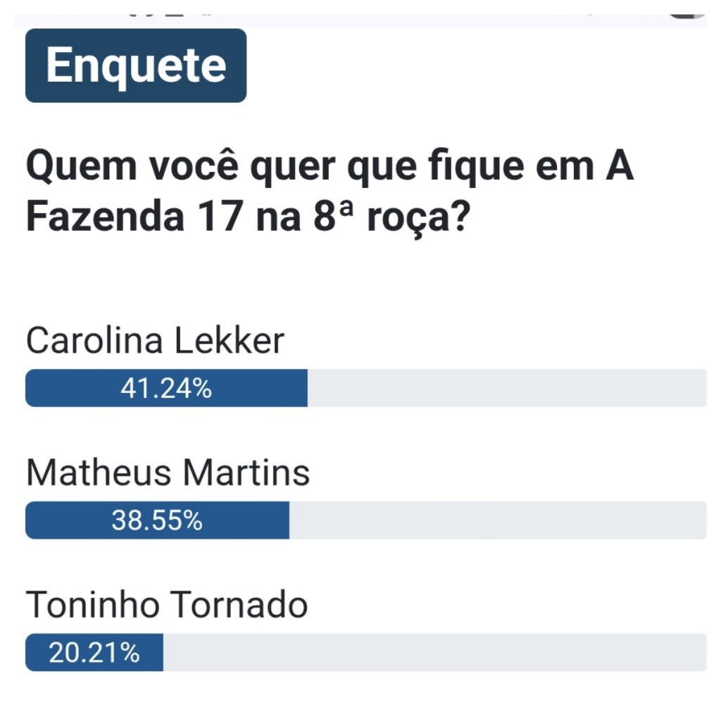 Carolina Lekker, Matheus Martins e Toninho Tornado estão na 8ª roça de A Fazenda 17. Os três roceiros foram definidos após a vitória de Saory Cardoso na Prova do Fazendeiro desta quarta (12). Fizemos um levantamento em algumas enquetes e Toninho Tornado desponta como o próximo eliminado de A Fazenda. Confira abaixo: