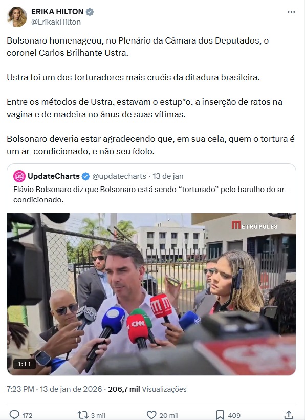 Na terça-feira (13), por meio da rede social X, Erika Hilton comentou declarações do senador Flávio Bolsonaro (PL), que afirmou que o pai estaria incomodado com o barulho do ar-condicionado no local onde se encontra. Para a deputada, a reclamação não se sustenta diante do histórico de posicionamentos do ex-presidente.