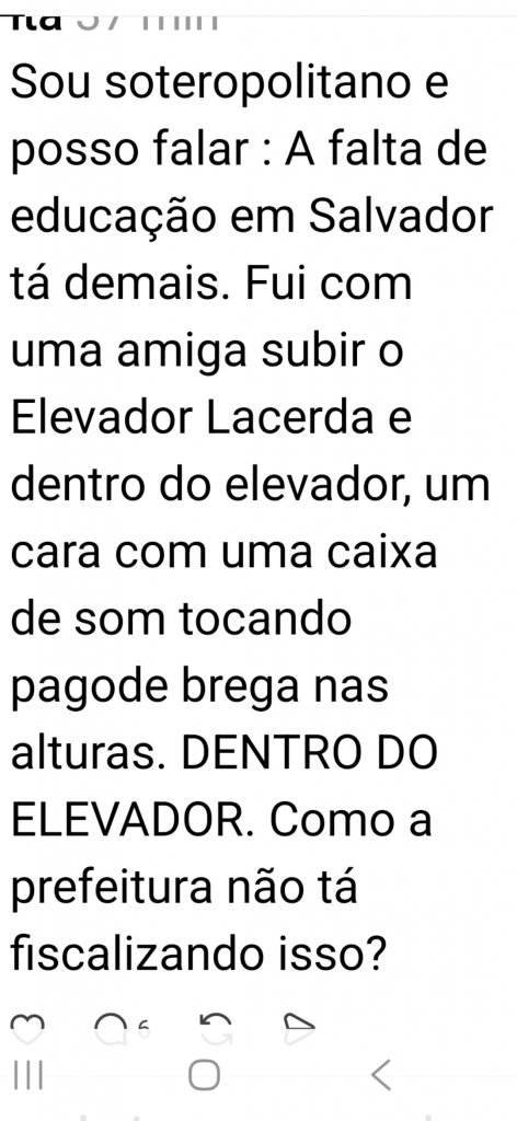 O escritor baiano Vinicius Oliveira, fez uma publicação na web, em que pede a fiscalização da Prefeitura de Salvador, no Elevador Lacerda. Ele testemunhou um passageiro com uma caixa de som na maior altura. Confira na íntegra: