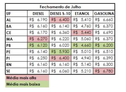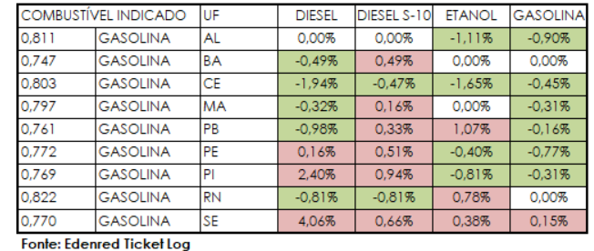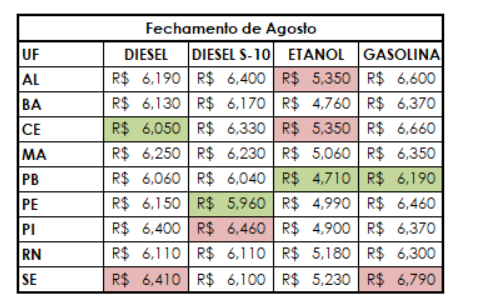 O Nordeste apresentou quedas nos preços do etanol, gasolina e diesel no mês de agosto, enquanto o diesel S-10 teve um aumento de 0,32%, passando a custar R$ 6,20. Os dados foram analisados pelo Índice de Preços Edenred Ticket Log (IPTL) e divulgados nesta terça-feira (9).