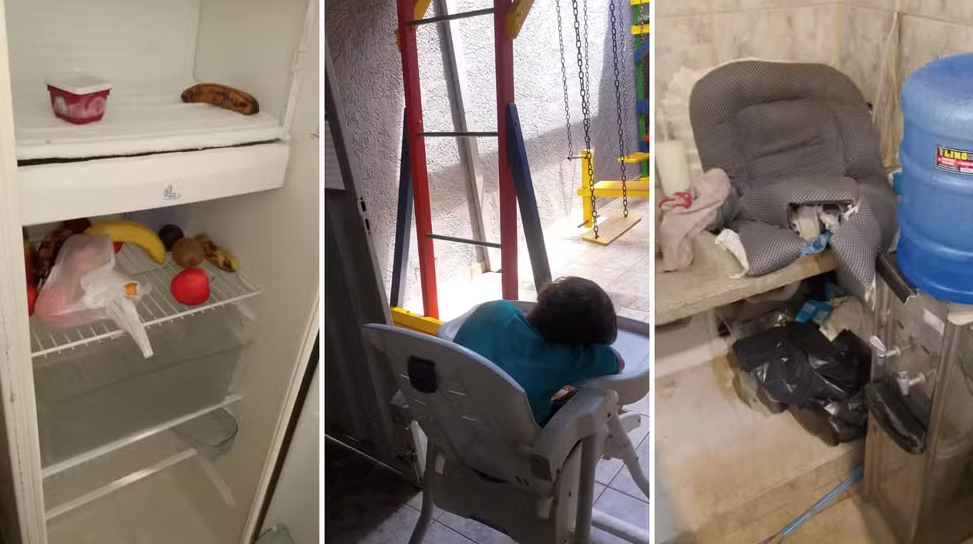 Em uma das imagens, o menino está sozinho, em uma sala vazia, sentado em uma cadeira de refeição. Segundo a mulher, ele era mantido isolado e sem refrigeração adequada.