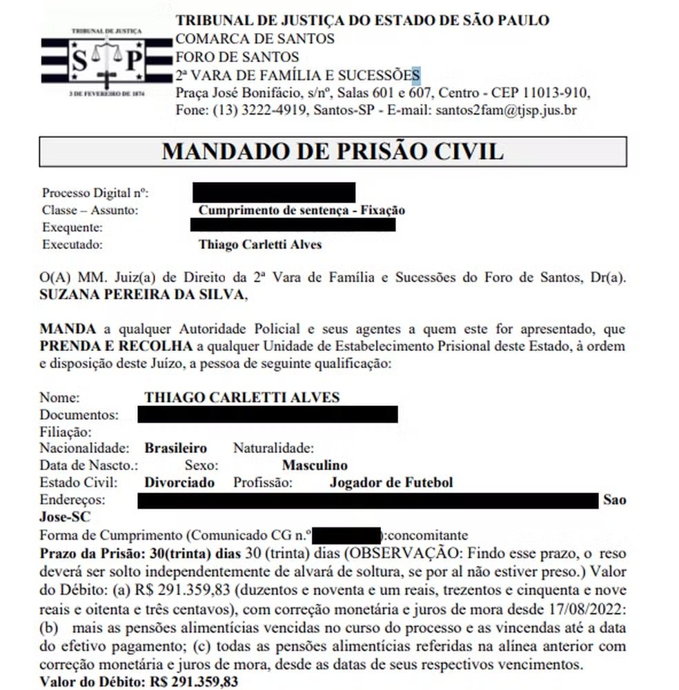 A informação foi divulgada pelo portal Globo Esporte. O pedido da prisão foi feito pela juíza Suzana Pereira da Silva, da 2ª Vara de Família de Santos.