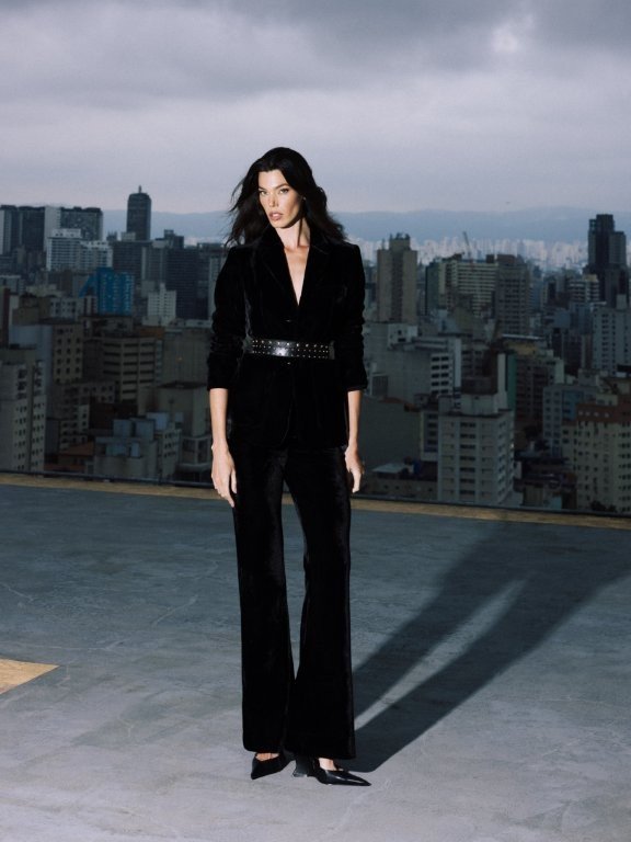 Entre as principais apostas da coleção está o contraste entre peças estruturadas e materiais delicados. Elementos como lã, couro e camurça aparecem em modelagens mais marcantes, enquanto a renda surge como contraponto leve e sensual, explorando transparências e sobreposições.