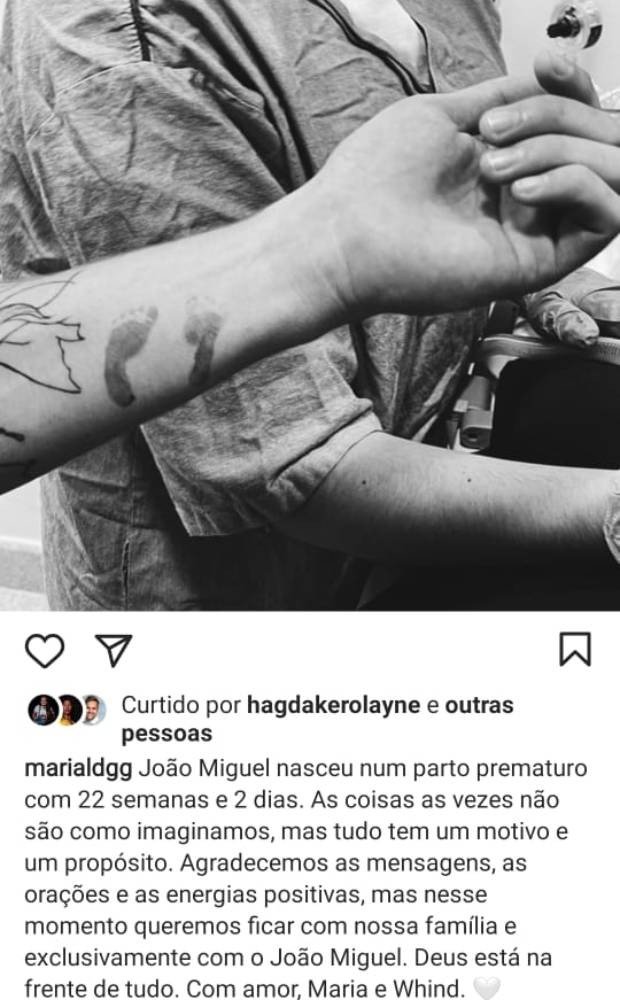 Segundo  a assessoria de imprensa de Whindersson, Maria Lina deu a luz à João Miguel em uma maternidade em São Paulo. "Por nascer prematuro, com 22 semanas, o bebê segue aos cuidados da pediatria neonatal", informou a equipe.