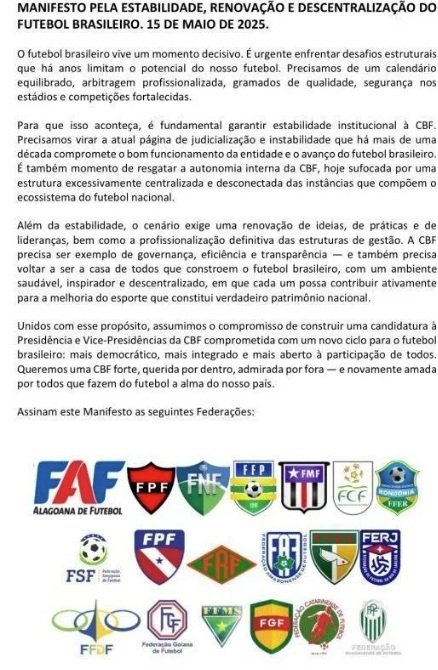 Oito federações optaram por não assinar o documento. São elas: São Paulo, Minas Gerais, Bahia, Pernambuco, Espírito Santo, Tocantins, Mato Grosso e Amapá. {Confira o documento abaixo}