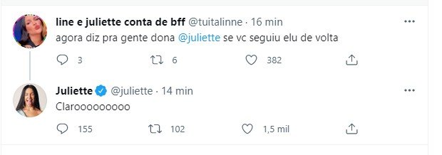 "A Demi Lovato me seguiu no Instagram.... eu tô passando mal", brincou Juliette em seu Twitter. "Eu preciso aprender inglês, Jesus. Como eu vou falar com esse povo", completou ela.