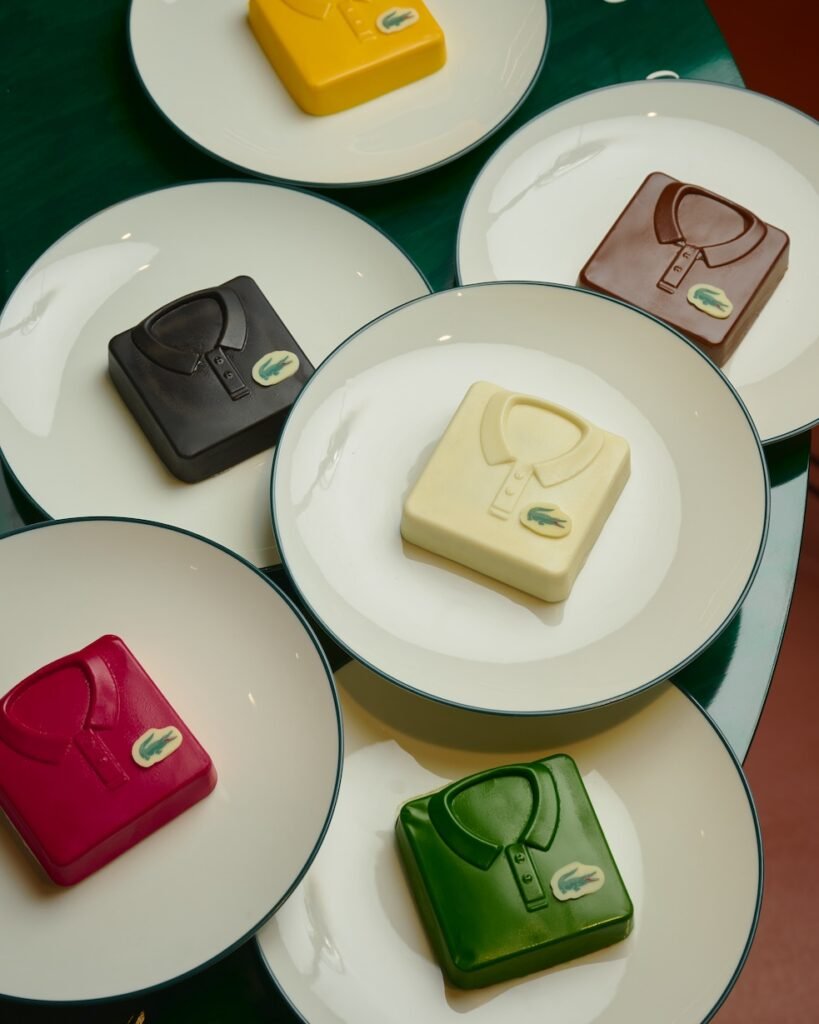 Inspirado na herança desportiva da maison, o design evoca os campos de ténis através de tons verdes profundos, terracota e linhas arquitetónicas que remetem ao universo do court. O menu apresenta criações como os bolos “Icônicos Polo” e a bebida assinatura “L’Eau de Croco”, combinando água de coco, matcha e gengibre. O conceito integra ainda uma loja dedicada com porcelana francesa exclusiva e têxteis selecionados, reforçando a fusão entre gastronomia, design e retalho.