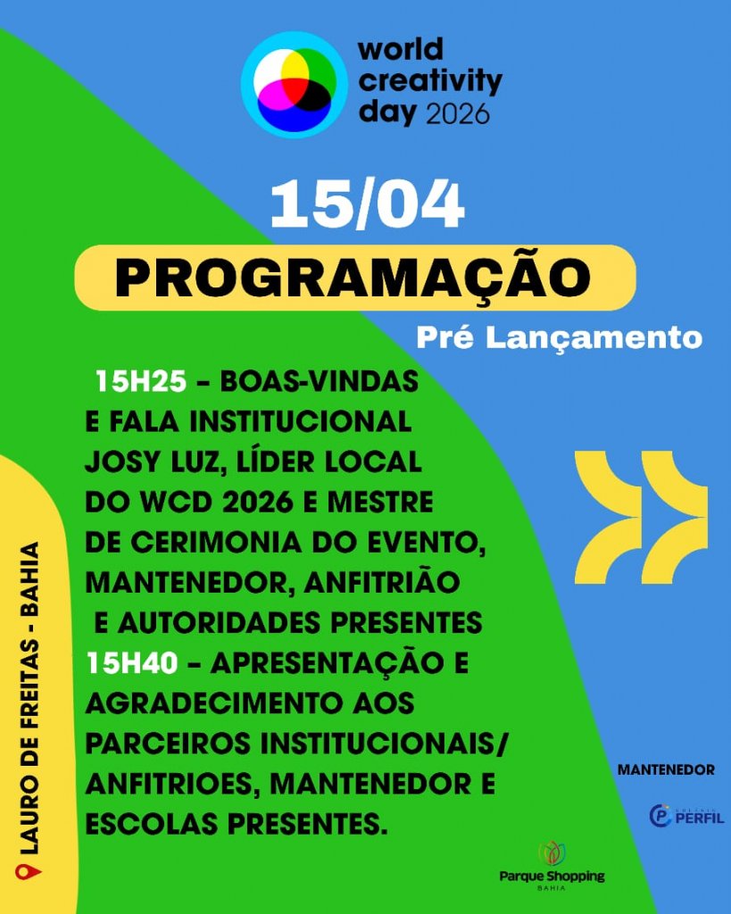 Lauro de Freitas dá o pontapé inicial para um dos maiores movimentos criativos do planeta com o lançamento oficial do World Creativity Day (WCD) 2026, que acontece no dia 15 de abril, às 14h, no Parque Shopping Bahia.
