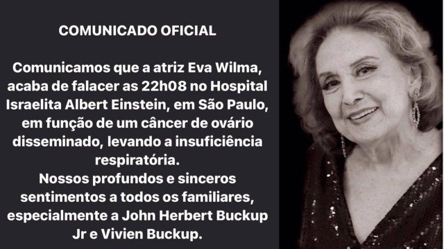 A maravilhosa Eva Wilma morreu hoje, aos 87 anos, em decorrência de câncer no ovário. A atriz faleceu às 22h08, no Hospital Israelita Einstein em São Paulo. A artista estava internada desde o dia 15 de abril, inicialmente para tratar problemas cardíacos e renais. O câncer foi descoberto no último dia 7 de maio.