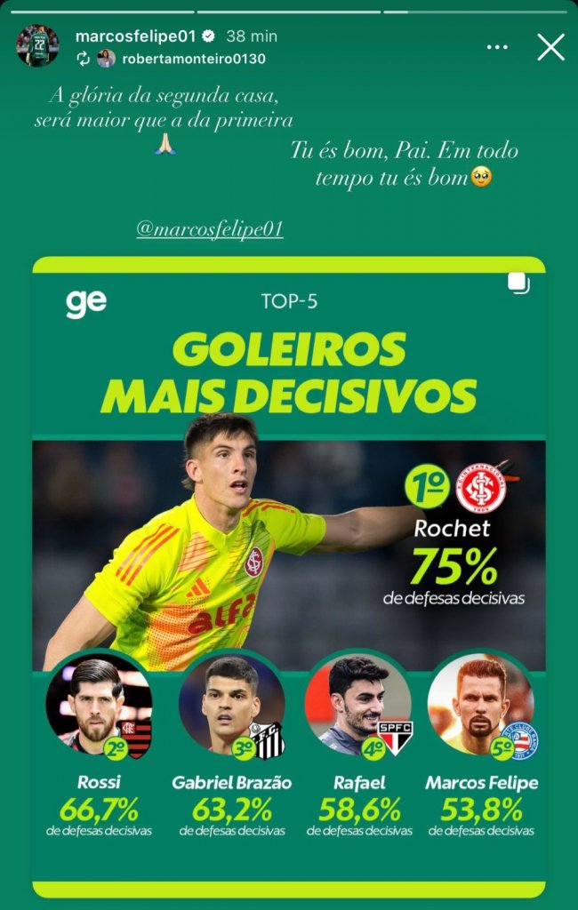O goleiro Marcos Felipe, agora ex-Bahia,foi eleito como quinto goleiro mais decisivo do primeiro turno do Brasileirão. As informações foram divulgadas pelo Gato Mestre, perfil do GE que levanta estatísticas de jogadores e clubes da Série A.