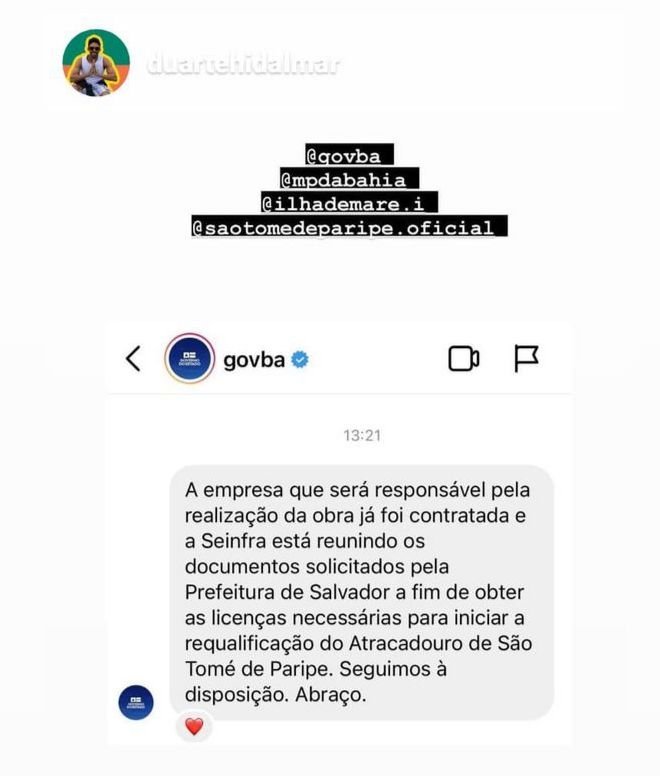 No primeiro contato, o perfil oficial do Governo da Bahia enviou um direct a um morador, que se manifestou nas redes sobre o caso, informando que "a empresa responsável pela realização da obra já foi contratada e a Seinfra está reunindo documentos solicitados pela Prefeitura de Salvador a fim de obter as licenças necessárias para iniciar a requalificação do Atracadouro de São Tomé de Paripe".