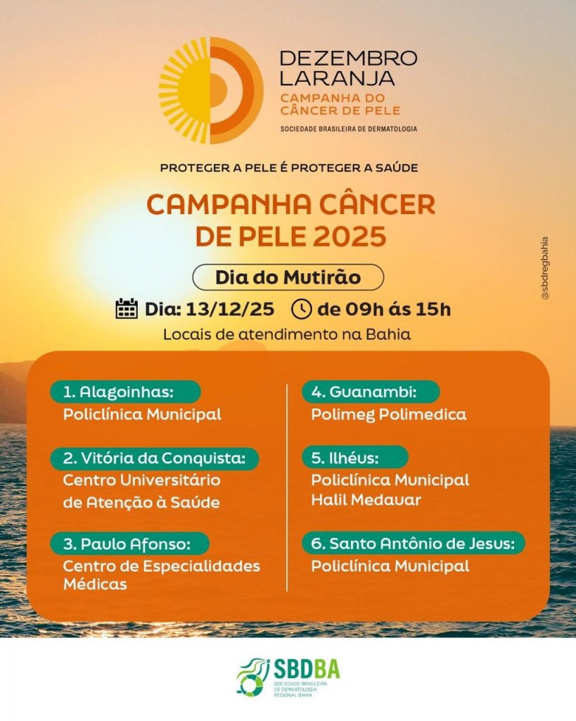 Mutirão gratuito de prevenção ao câncer de pele acontece sábado (13) em 7 municípios da Bahia!