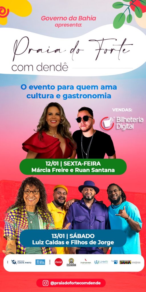 E nasce o Festival Praia do Forte com Dendê - Arte e Cultura, um evento que celebra a riqueza cultural e gastronômica da Bahia, tão presentes no Brasil e unanimidade entre os consumidores e apreciadores da boa comida. Este festival é uma jornada de valorização das manifestações culturais, com o intuito de fortalecer e revitalizar a cultura local por meio da música, dança, oficinas, exposição literária e gastronomia. Uma oportunidade para descobrir novos sabores, apreciar a cultura local e celebrar a diversidade da região. O evento ocorrerá de 11 de janeiro a 24 de fevereiro, oferecendo uma variedade de atrações, como abertura na Vila de Praia do Forte, dois dias de shows no Castelo Garcia D´Ávila, exposição literária, feira de artesanato, feira gastronômica e bate-papo musicado. Os principais shows incluem artistas renomados como Luiz CaldasFilhos de Jorge, Márcia FreireRuan Santana e Banda Monarka.