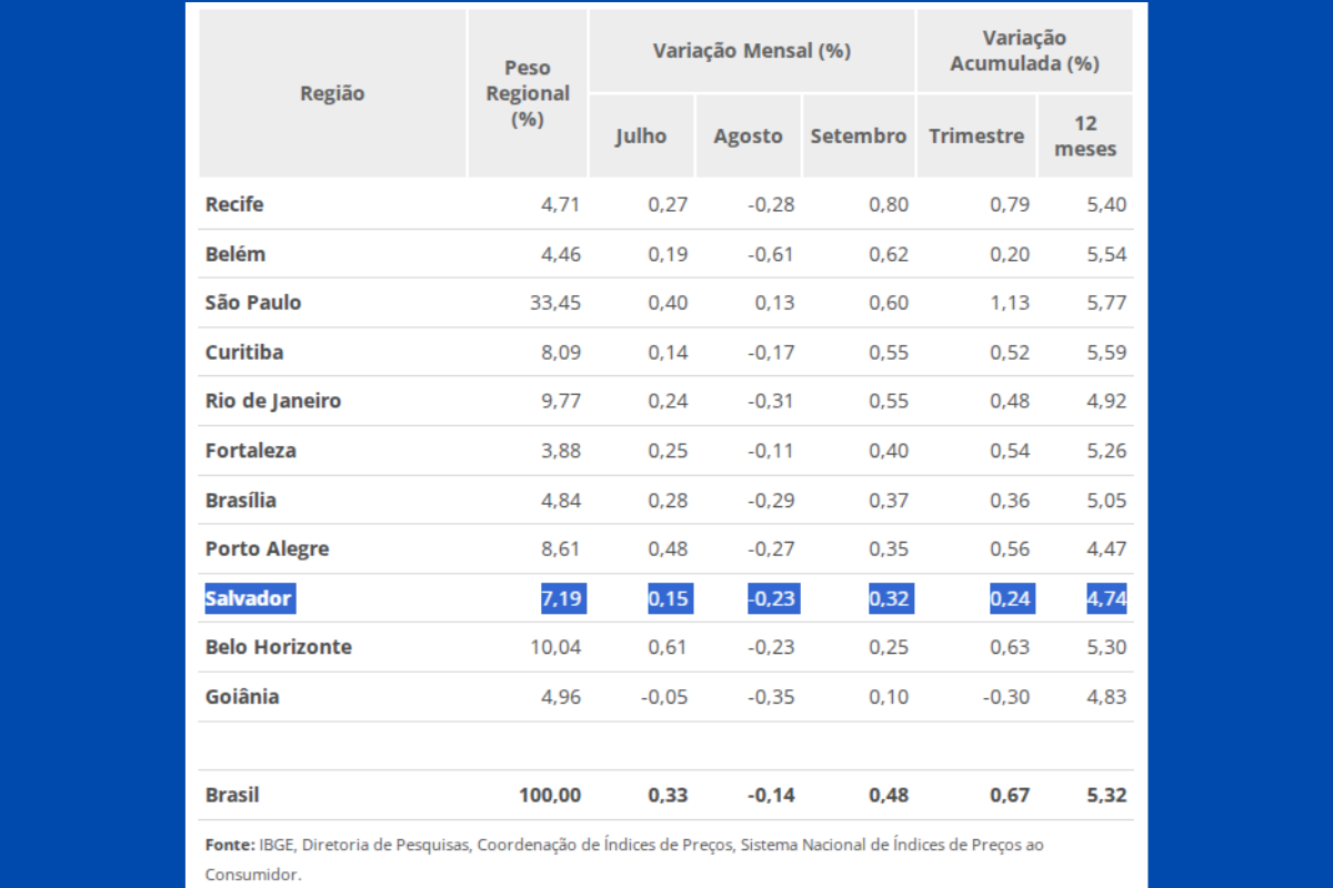 O Índice Nacional de Preços ao Consumidor Amplo (IPCA-15), ferramenta utilizada como uma prévia de inflação oficial do mês, calculado pelo Instituto Brasileiro de Geografia e Estatística (IBGE), ficou em 0,32% na Região Metropolitana de Salvador (RMS).