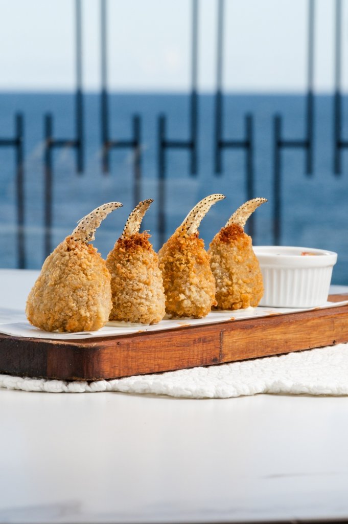 Entre as entradas, as Vieiras à Francesa chegam grelhadas na concha, com manteiga aromatizada, alho, salsa e toque de limão, enquanto o Burger de Siri Mole aposta em uma combinação inusitada, com molho tártaro, emulsão de avocado e ovas de massago. O Frito Misto reúne uma seleção de frutos do mar empanados, como siri mole, polvo, camarão, lula e mexilhões, e a Coxinha de Siri aparece como releitura sofisticada do clássico, com massa leve de batata e recheio bem temperado.