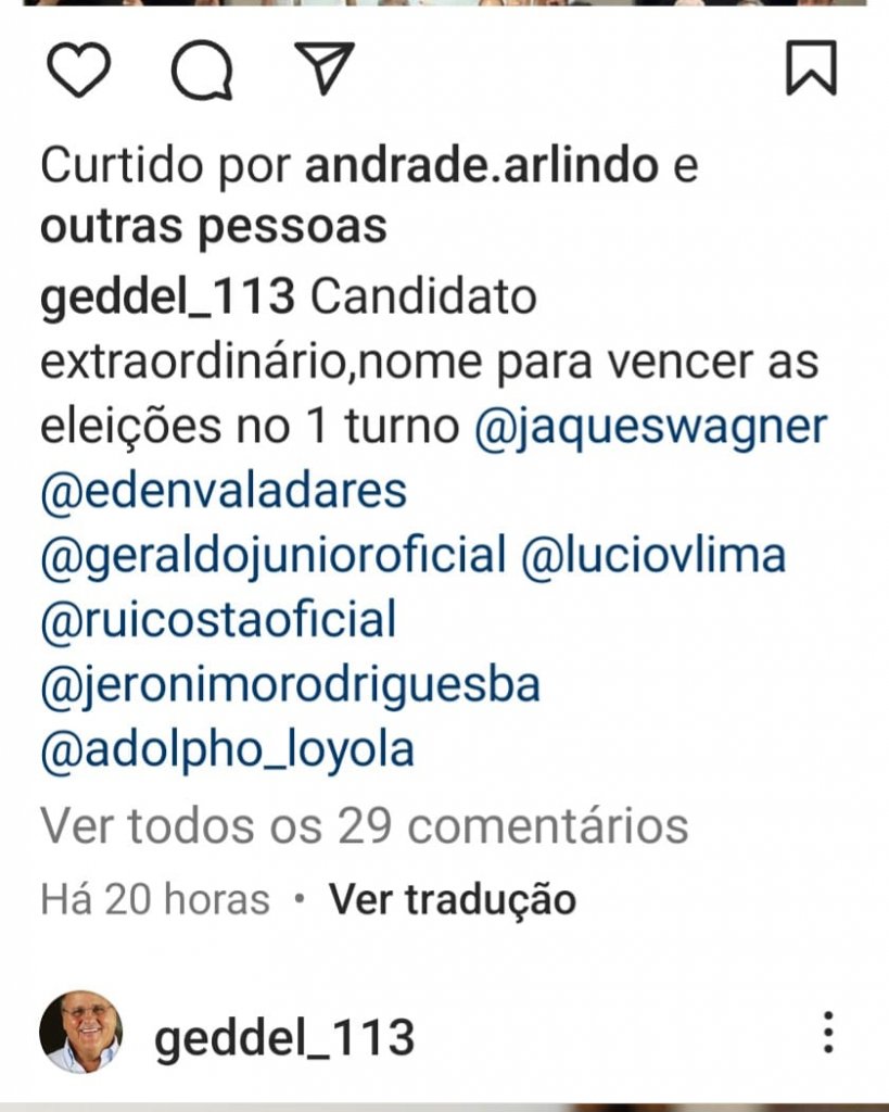 Após a confirmação do Diretório Executivo do PT de que indicará o nome do deputado Robinson Almeida para disputar a prefeitura de Salvador - conforme noticiado em primeira mão por este colunista - o MDB fez questão de deixar claro sua insatisfação com a escolha. Em postagem nas redes sociais, o cacique do partido, Geddel Vieira Lima se referiu a Robinson ironicamente como um "candidato pra vencer em primeiro turno" e ainda fez questão de marcar os líderes da sigla - além de claro - o vice-governador Geraldo Júnior, escanteado pelo PT.
