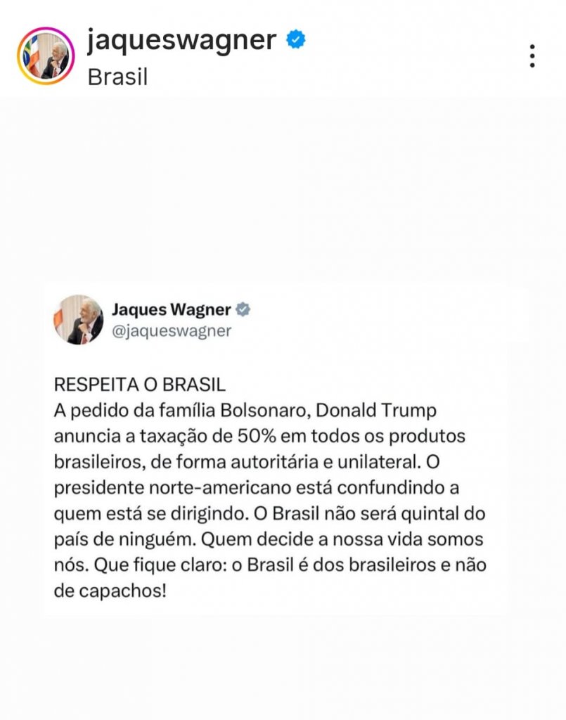 Segundo Wagner, foi a família Bolsonaro quem conseguiu o "feito" de dar uma ordem a Trump para taxar o Brasil!
