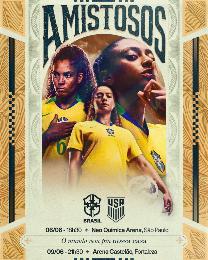 Em mais uma etapa na preparação para a Copa do Mundo de 2027, a Seleção Brasileira Feminina vai disputar dois amistosos, em junho, contra os EUA. A primeira partida será no dia 6, na Neo Química Arena, em São Paulo. A outra, no dia 9, no Castelão, em Fortaleza. Essas duas sedes vão receber jogos do Mundial.