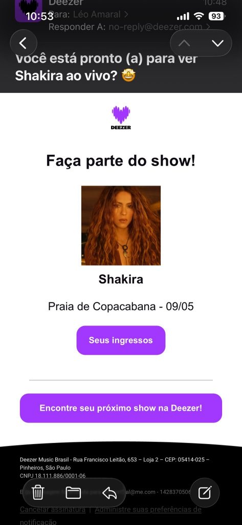 E-mail de plataforma de música convidando usuários para show de artista colombiana