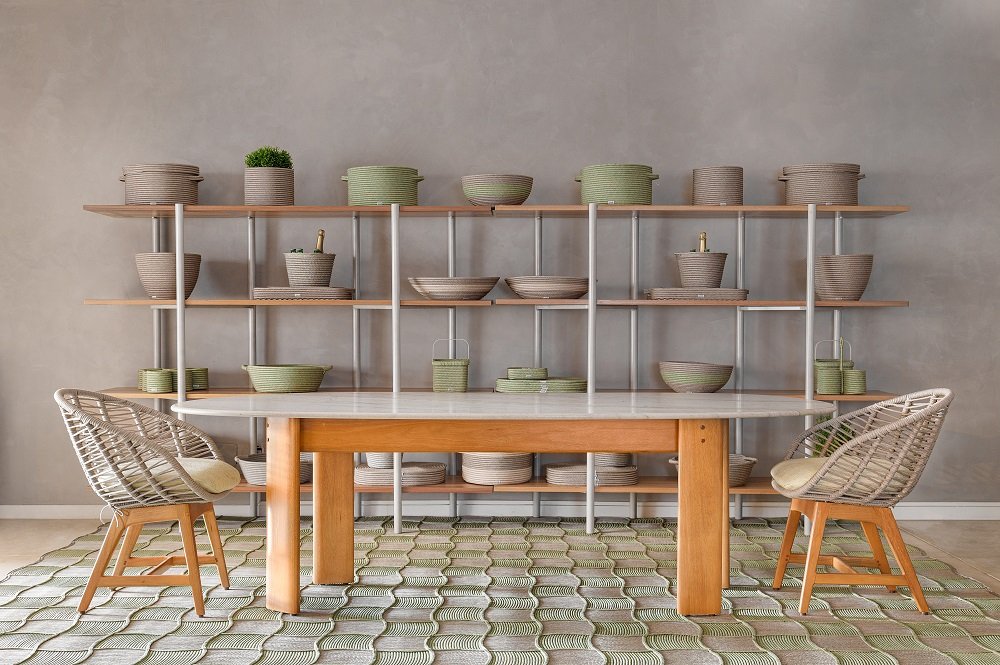 Com espaldar alto e pés de madeira, as peças da Shell apresentam design leve devido à trama escolhida. “Apesar de ocuparem maior espaço visual, os móveis são fluídos e permitem integração por terem na tecelagem elementos vazados”.