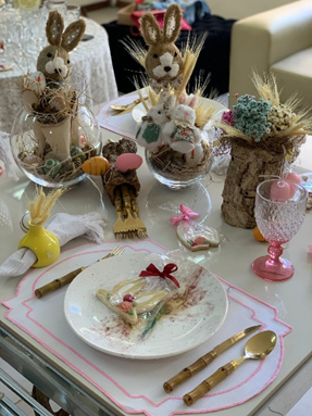 O evento contou também com a apresentação de uma Mesa Posta de Páscoa, assinada por Celeste Leão, inspirada nas cores suaves e elementos da natureza. “Busquei combinar criatividade e acessibilidade na escolha de objetos com valor agregado menor para a composição. Optei pelas cores pastéis, como o rosa bebê, o amarelo e o branco, com peças delicadas e românticas como a Páscoa pede e, ao mesmo tempo, um toque de natureza com troncos de árvores, trigo, barba de bode e flores secas do cerrado”, explica a arquiteta.
