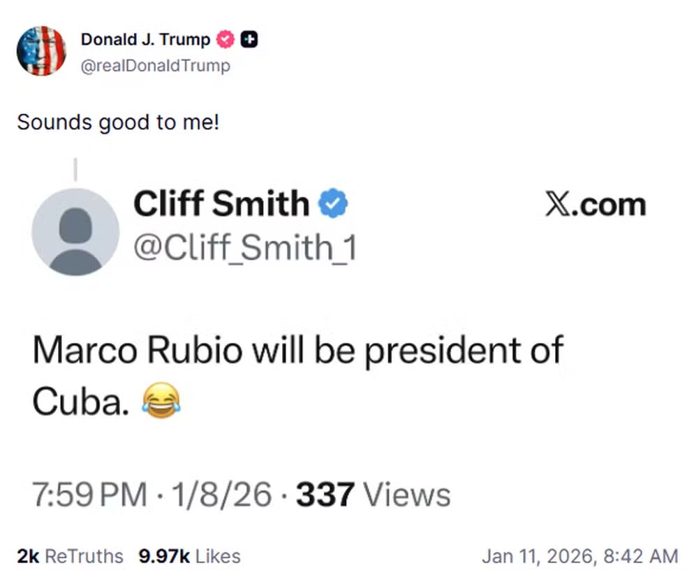 Publicada em 8 de janeiro, a mensagem do X dizia: "Marco Rubio será presidente de Cuba. 😂", em tom humorístico. Em sua rede social, a Truth Social, Trump republicou uma imagem da publicação e escreveu: "Por mim, tudo bem!".