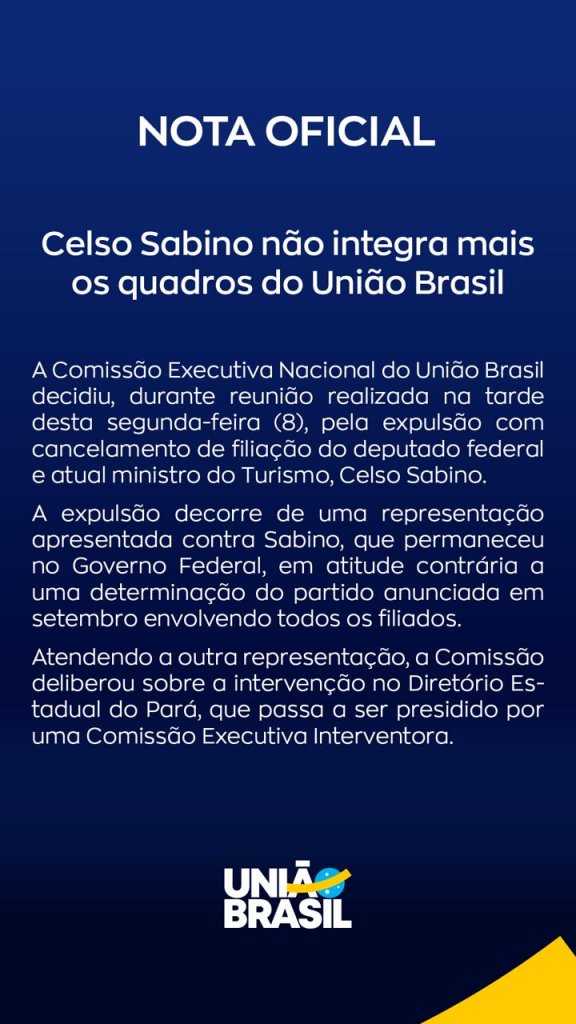 O União Brasil anunciou, nesta segunda-feira (8), a expulsão do ministro do Turismo, Celso Sabino, do partido. O motivo foi a permanência no Governo Federal mesmo após a determinação que os filiados deixassem os cargos até o dia 19 de setembro.