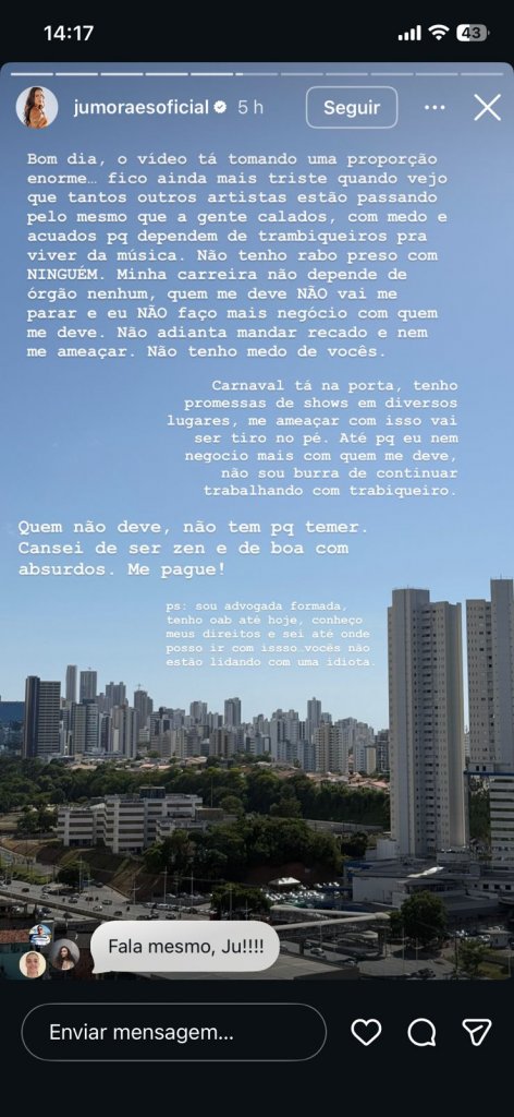 Vídeo: cantora Ju Moraes ameaça expor devedores e dá prazo de uma semana para pagamentos: 'cansei de ser paciente'